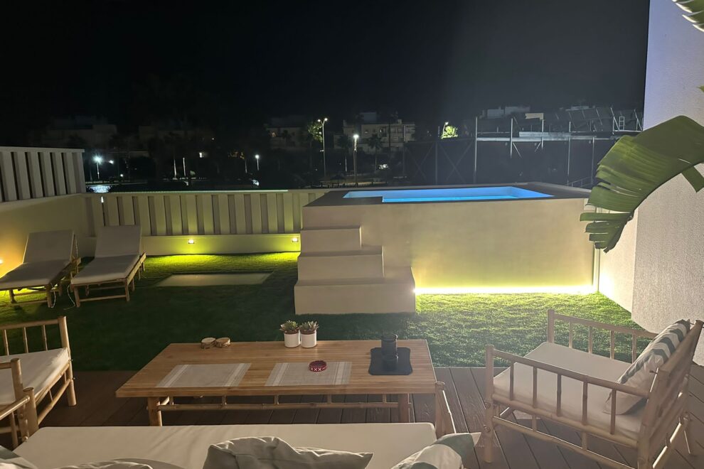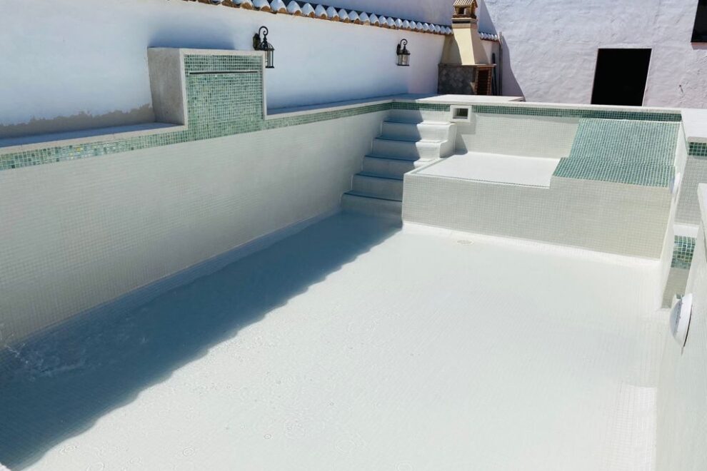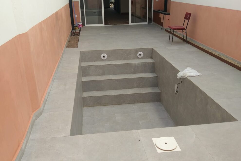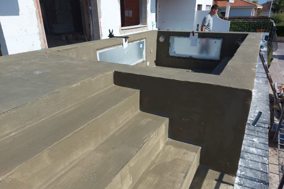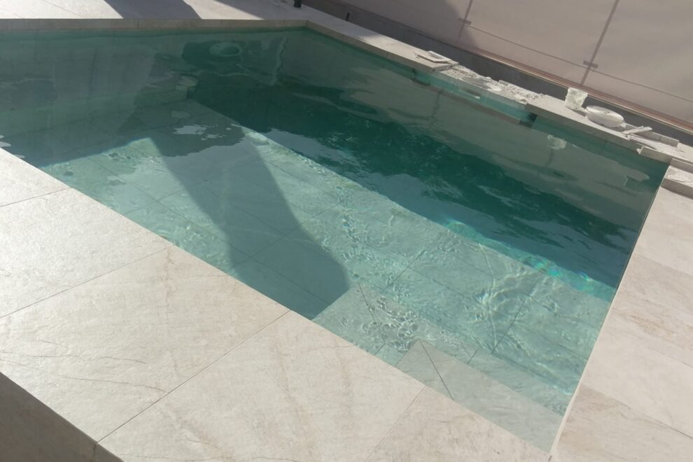 Piscina realizada íntegramente en EPS y acabada en PORCELÁNICO, tiempo de ejecución una semana, sin permisos ni albañiles. Piscina de tamaño mediano situada en una terraza de un dúplex en pleno centro de ALBACETE. Dispone de cloración salina y agua caliente con calentador eléctrico. Un lujo en el centro de la ciudad.